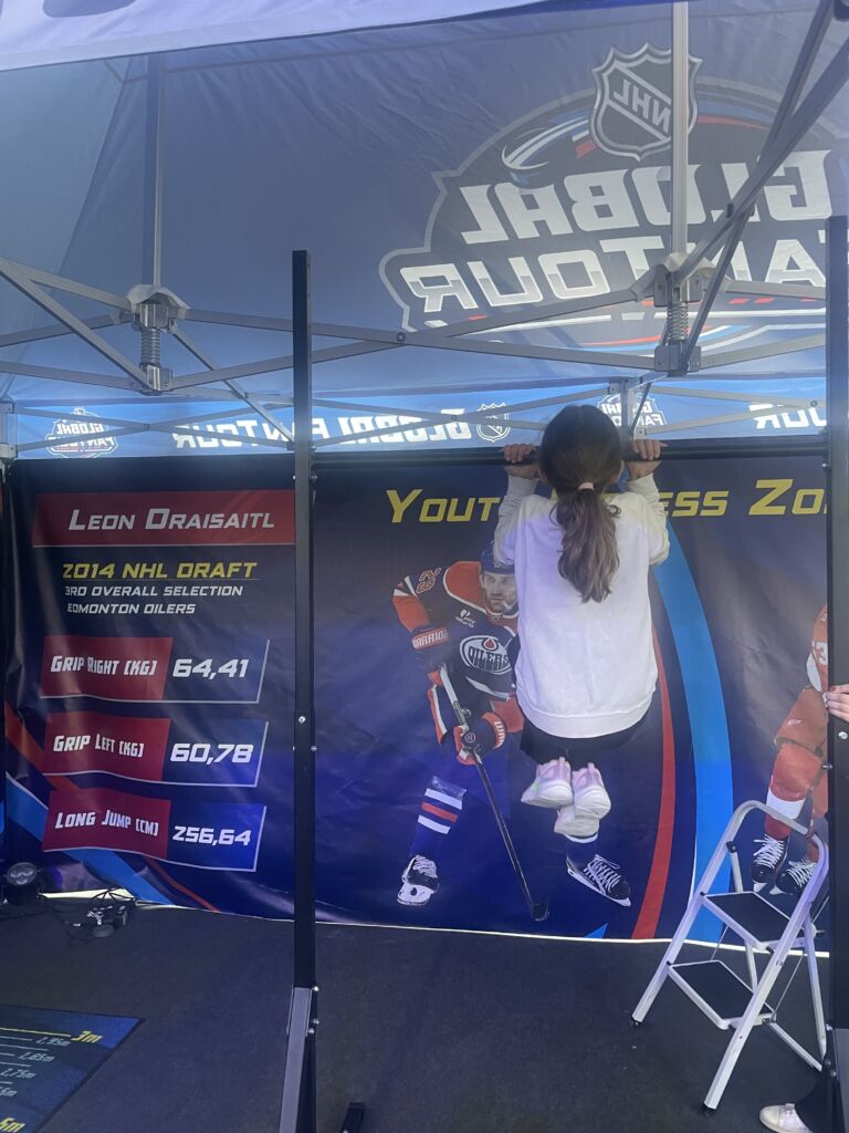 Wir sind dort mit der U72 hingefahren. Nach ungefähr 30 Minuten Fahrt, sind wir endlich angekommen. Als wir dort waren, haben wir erstmal gefrühstückt. Danach haben wir von den Veranstaltern eine Stempelkarte bekommen. Mit der Stempelkarte konnten wir von Station zu Station gehen. Es gab ganz verschiedene Stationen. An einer Station musste man zum Beispiel Klimmzüge machen. An einer anderen Station konnte man das Dribbeln mit dem Puc üben. Man durfte auch auf verschiedene Tore schießen und konnte dabei zum Beispiel die Geschwindigkeit des Schusses messen lassen oder versuchen an einer Torwartfigur vorbeizuschießen. Als die Stempelkarte voll war, hat man ein Poster und kleine Hockeykarten zum Sammeln und Tauschen bekommen. Alle Stationen haben Spaß gemacht. Nach insgesamt drei Stunden Spaß mussten wir leider wieder zurück. Dieser Tag war so schön. Da müssen wir unbedingt nochmal hin.