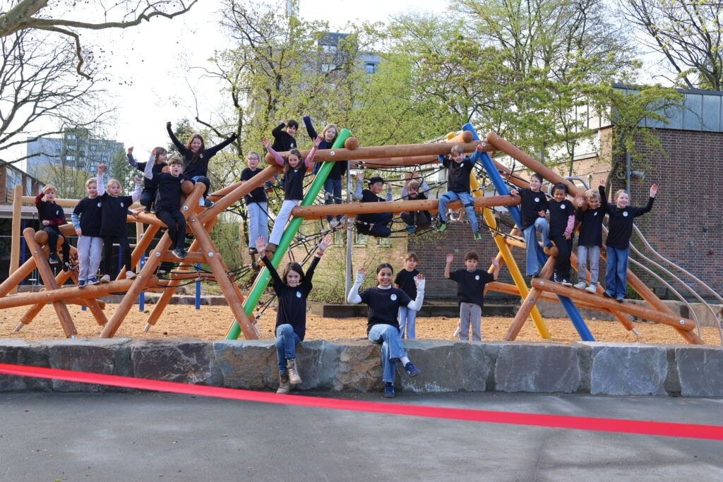 Und nun gibt es auf dem Schulhof unserer Schule wieder einen farbenfrohen Mittelpunkt, der zum Spielen und Verweilen einlädt. Die Kinder freuen sich auf das Spinnennetz, die Möglichkeiten zum Hangeln, die Klettertaue die schrägen Rutschstangen und die Podeste an den Rändern zum Chillen.