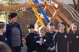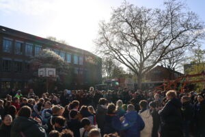 Am Donnerstagmorgen haben sich alle Klassen direkt zu Schulbeginn auf dem großen Schulhof rund um das neue Klettergerüst versammelt. Sogar ein paar neugierige Eltern haben vorbeigeschaut. Zu Beginn haben einige Kinder aus dem Schüler*innen-Parlament ein paar Worte gesagt und Frau Huschauer hat eine kleine Rede gehalten. Anschließend haben alle gemeinsam den Gute-Laune-Tanz getanzt. Der guten Laune hat zu unserer größten Freude auch das Wetter keinen Strich durch die Rechnung gemacht. Die ganze Woche haben wir gebangt, aber pünktlich zur Eröffnung strahlte entgegen der Prognose die Sonne vom blauen Himmel. Da haben uns die frostigen Temperaturen gar nichts ausgemacht. Und danach kam endlich der große Moment: Emma aus der 3a durfte das rote Band durchschneiden, das zwischen zwei Elementen des Bauzauns gespannt war. Damit war unser Klettergerüst endgültig eröffnet. Nacheinander durften unsere Schülerinnen und Schüler jahrgangsstufenweise auf dem Spielgerät klettern und toben. In der Zwischenzeit durften alle anderen auf dem Schulhof spielen und sich an dem von Eltern gestifteten Buffet mit Kuchen, Süßigkeiten und Obst erfreuen. Was für ein herrlicher Vormittag als Einstimmung auf die bevorstehenden Osterferien!