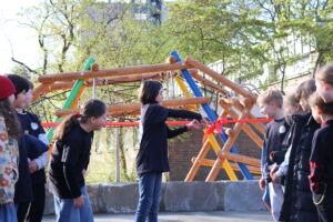 Und nun gibt es auf dem Schulhof unserer Schule wieder einen farbenfrohen Mittelpunkt, der zum Spielen und Verweilen einlädt. Die Kinder freuen sich auf das Spinnennetz, die Möglichkeiten zum Hangeln, die Klettertaue die schrägen Rutschstangen und die Podeste an den Rändern zum Chillen.
